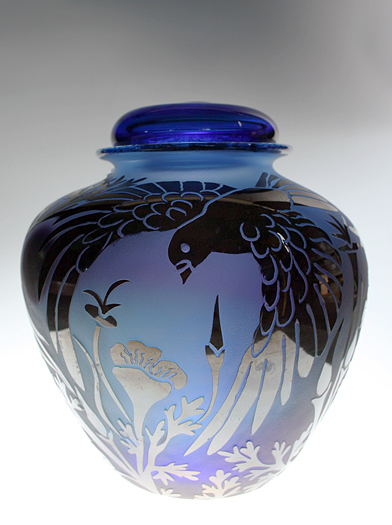 Working closely with a respected glassblower, Buzz Blodgett, Nancy seeks several important elements prior to beginning her fastidious engraving process. She wants the shape of her urns to function so that the person carrying it would do so with cupped hands embracing it. She wants rich, saturated color.