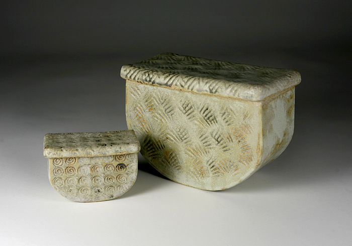 Ann Bates makes one-off, hand built contemporary ceramic pieces that are both sculptural and functional. We are particularly charmed that the rocker vessels actually rock... gently back and forth. Over the years, her distinctive style has evolved from emotional responses and associations with the landscape through the study of geological formations and the decoration on ancient standing stones, in particular the spiral—the natural form of growth and symbol of everlasting life. While much of her work includes reference to leaves, seed pods and butterfly eggs for shape, texture and form, the spiral is always present and is her mark.