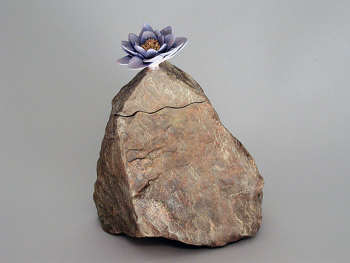 Romantic, beautiful, and replete with symbolism, the vessel appears to be a small boulder with a blue lotus emerging from its crown, but is in fact a very light clay hollow vessel. Its concept, charm and exquisite execution all contributed to Jack Thompson earning the People’s Choice Award at the close of FUNERIA’s 3rd international Ashes to Art® exhibition in 2006.
